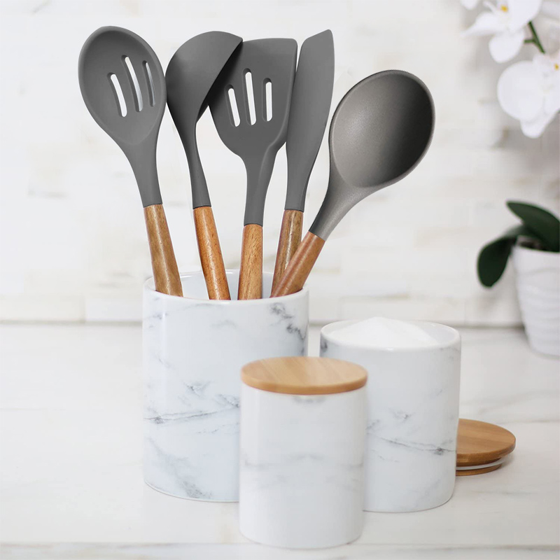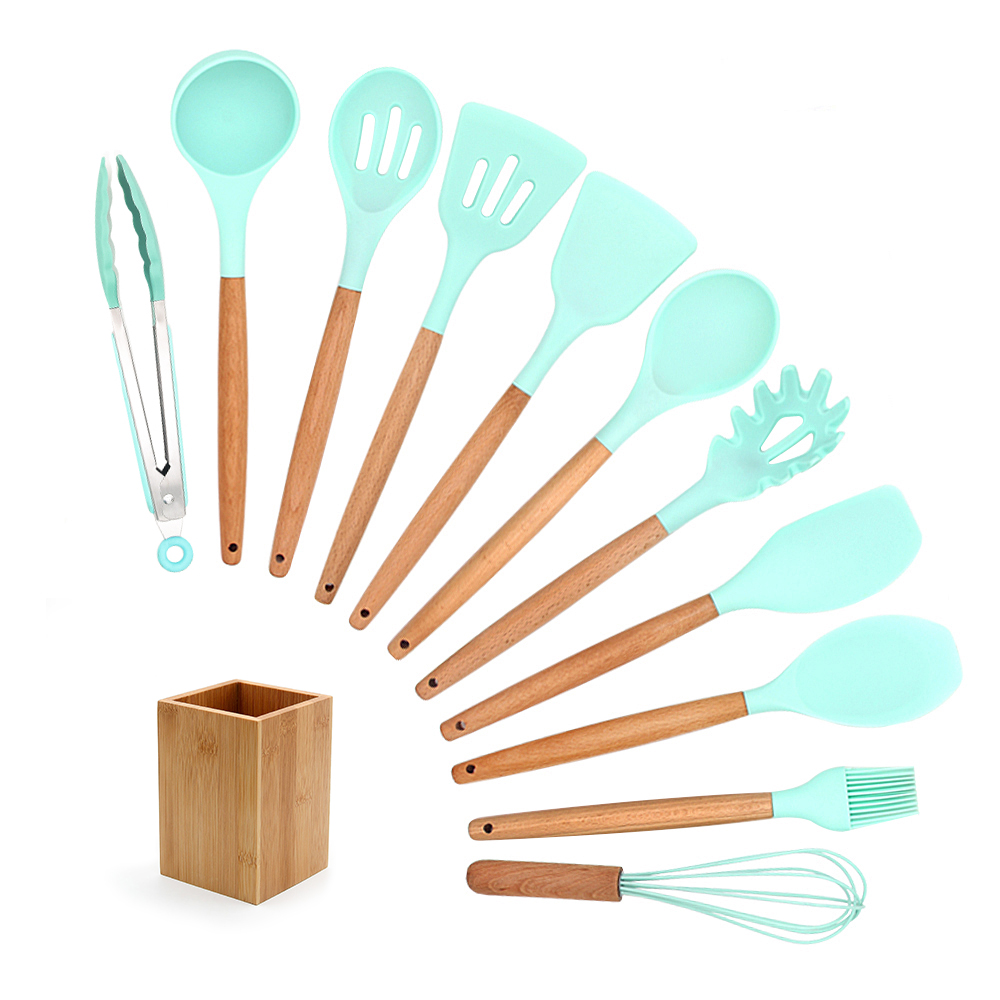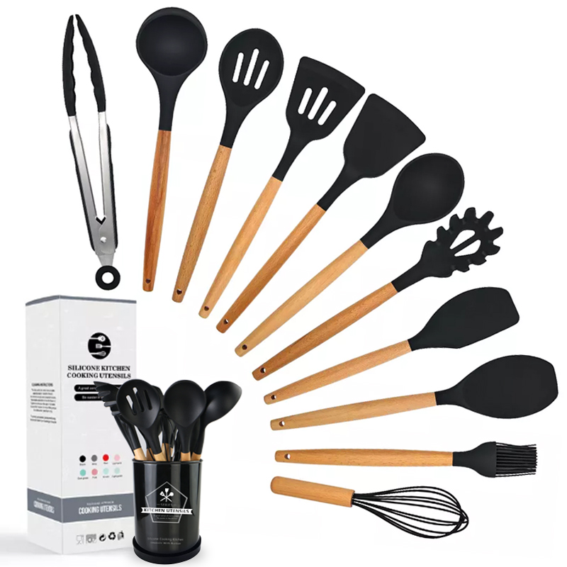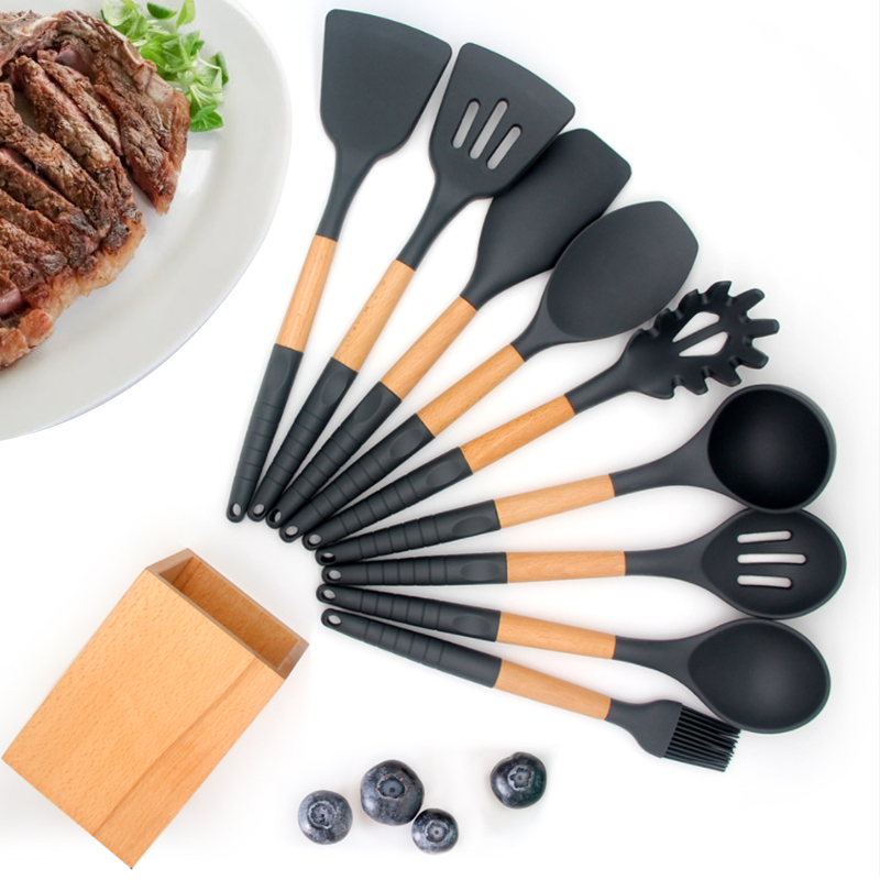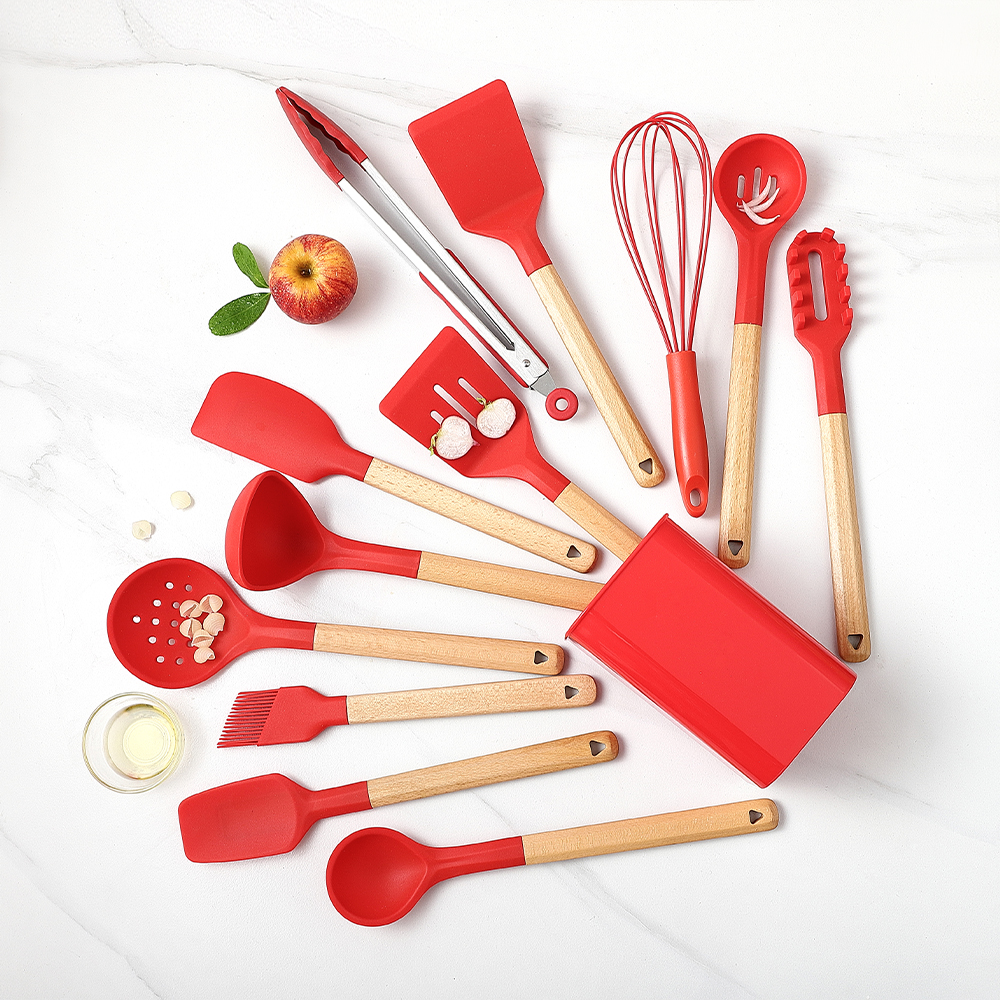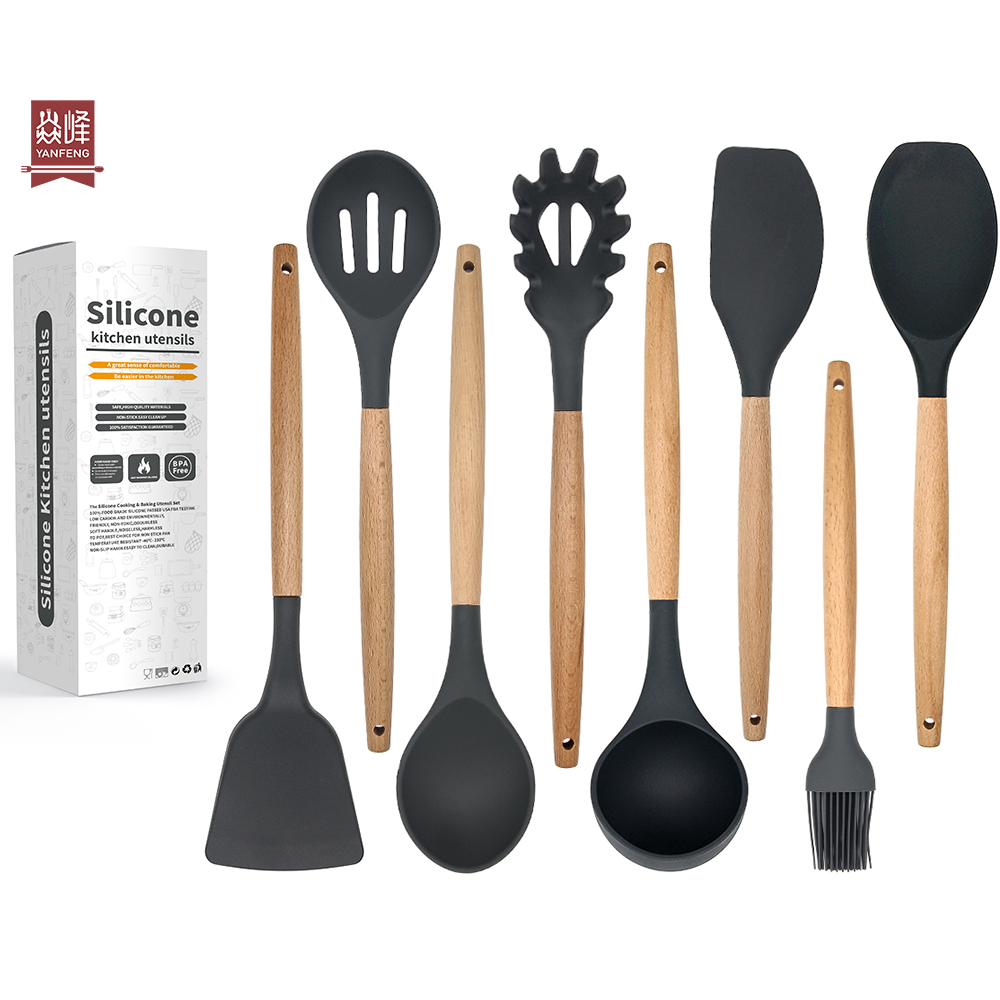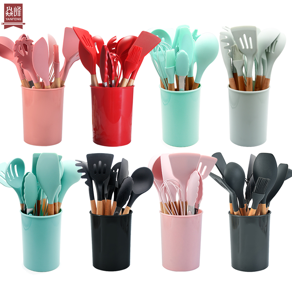 700g पूर्ण Yf ब्रांड 12-टुकड़ा गैर-छड़ी सिलिकॉन रसोई बर्तन लकड़ी के हैंडल मॉडल YFC-038 के साथ सेट